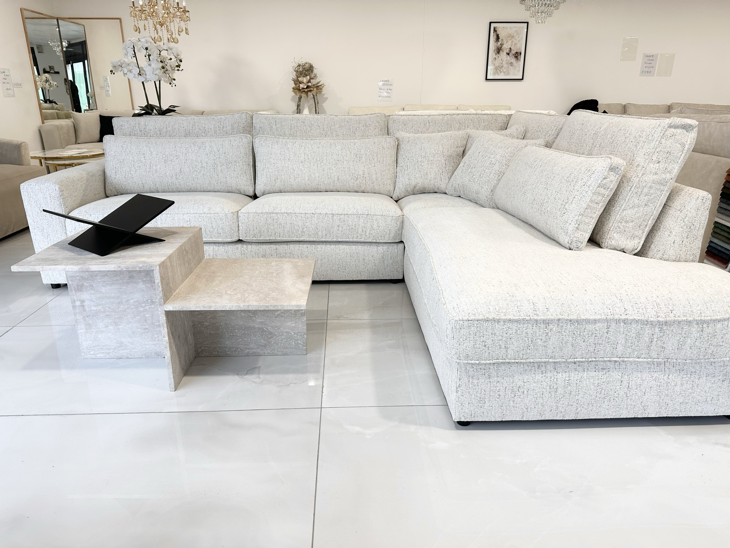 Canapé d'angle en tissu beige clair avec coussins, table basse en pierre assortie, décor moderne avec miroir et œuvres d'art