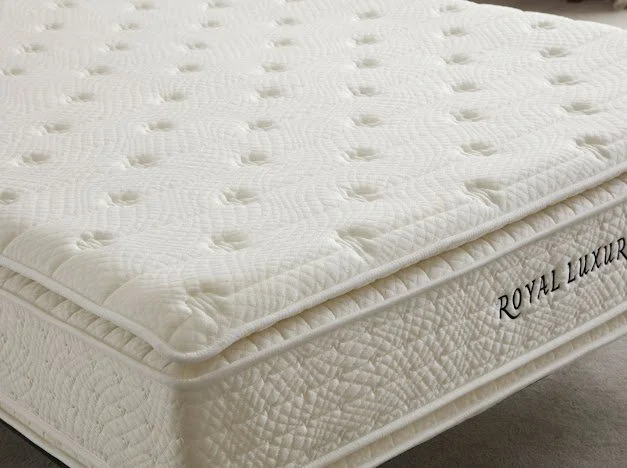 Un lit avec une tête de lit rembourrée, une table de chevet assortie, tout en tissu beige